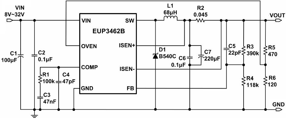 The EUP3462B is a step-down converter capable of driving 3A continuous load with excellent line and load regulation. The EUP3462B operates in either CC (Constant Current) mode or CV (Constant Voltage) mode with an input voltage range from 8V to 32V. The EUP3462B provides programmable cable compensation by adjusting external resistor divider. The EUP3462B stops switching when the output reaches over voltage threshold which is programmed by external resistor divider. Fault protection includes secondary cycle-by-cycle current limit, short circuit protection and thermal shutdown. In shutdown mode the regulator draws 3μA of supply current. Internal soft-start minimizes the inrush supply current and the output overshoot at initial startup.