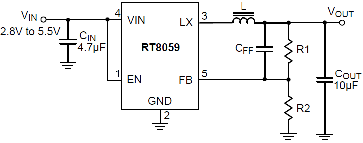 The RT8059 is a high efficiency Pulse Width Modulated (PWM) step-down DC/DC converter, capable of delivering 1A output current over a wide input voltage range from 2.8V to 5.5V. The RT8059 is ideally suited for portable electronic devices that are powered by 1-cell Li-ion battery or by other power sources within the range, such as cellular phones, PDAs and handy-terminals.The RT8059 enters low dropout mode when normal PWM cannot provide regulated output voltage by continuously turning on the upper P-MOSFET. The RT8059 enters shutdown mode and consumes less than 0.1μA when the EN pin is pulled low.