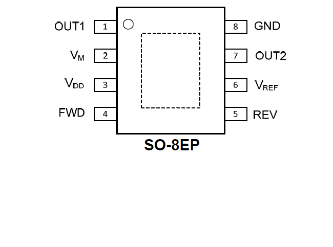 The ZXBM5210 is a single chip solution for driving a single-coil reversible direct current (DC) fans and motors. The integrated fullbridge driver output stage is designed to minimize audible switching noise and electromagnetic interference (EMI) providing a low noise solution For system flexibility, the device has four modes of operation: Forward, Reverse, Brake and Standby selected via FWD and REV pins. The Forward and Reverse modes provide the motor rotation direction control, the Brake mode allows quick stop and the Standby mode helps system efficiency by powering down most of the internal circuits to consume less than 32uA typical. The motor speed can be adjusted by changing the duty ratio of the PWM signal on the FWD or REV pins in the PWM mode or alternatively by adjusting DC voltage input signal to the VREF pin in the VREF speed control mode.