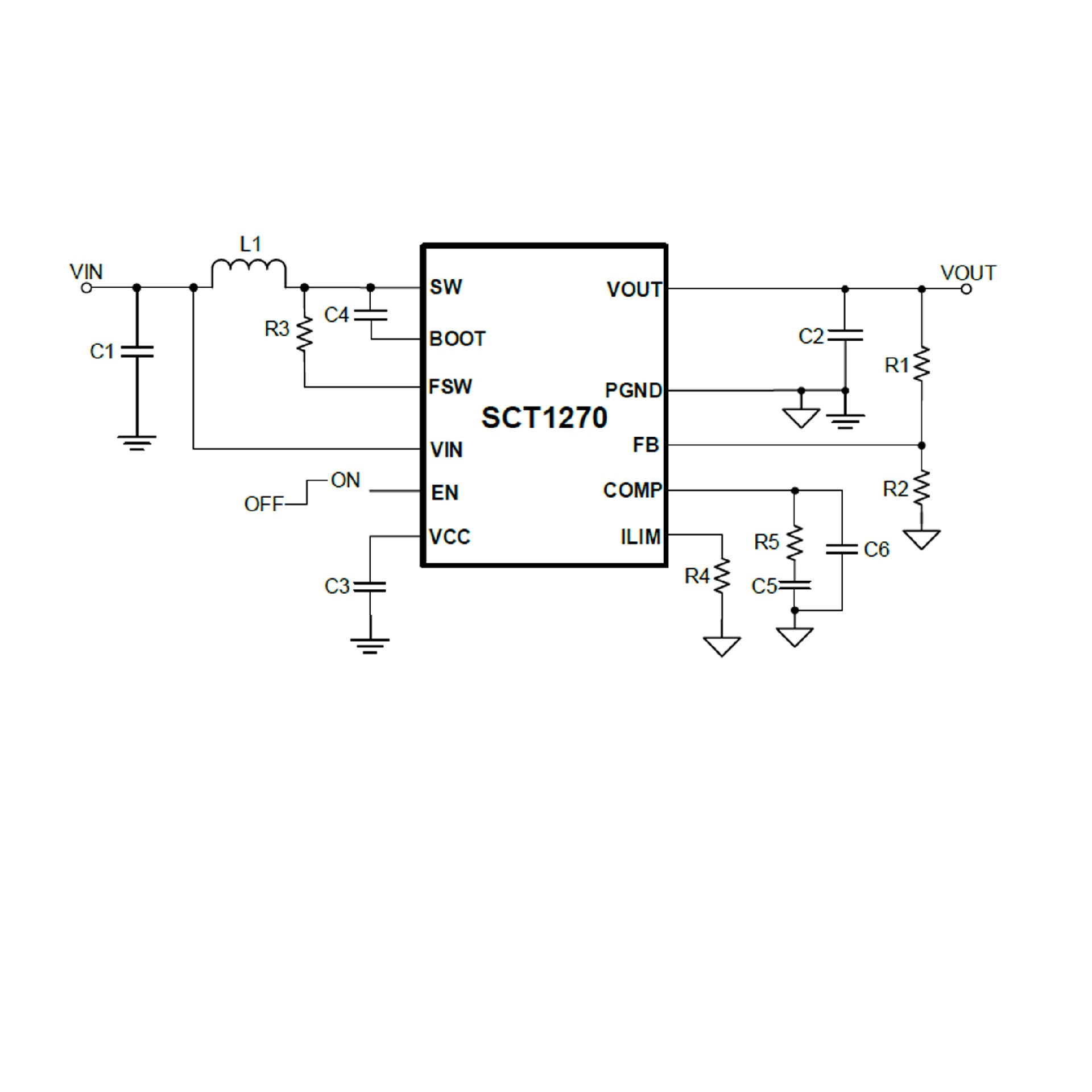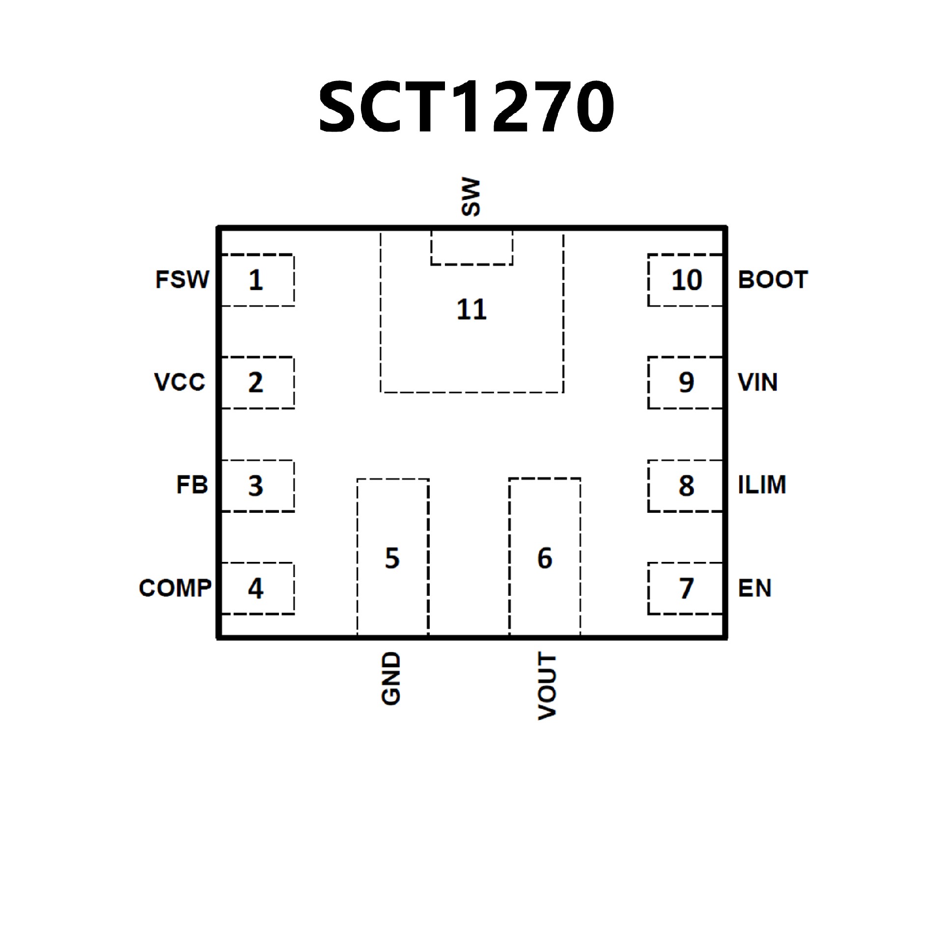 The SCT1270 is a high efficiency synchronous boost converter with fully integrated a 17mΩ high-side MOSFET and a 14mΩ low-side MOSFET, featuring 2.7V to 12V input voltage range to support single cell or two cell Lithium ion/polymer batteries and up to 9.5A peak switch current. The switch current limit can be adjustable with an external resistor. The SCT1270 has 7A continuous switch current capability and provides output voltage up to 12.6V.The SCT1270 adopts constant off-time peak current control to provide fast transient response. An external compensation network allows flexibility setting loop dynamics to achieve optimal transient performance at different load conditions.The SCT1270 works in the PWM at moderate and heavy load condition. The SCT1270 offers PFM mode at light load condition. The switching frequency is adjustable from 200KHz to 2.2MHz.The SCT1270 features output overvoltage protection and thermal shutdown protection when the device over loads.The device is available in a QFN-11 2mm x 2.5mm package.