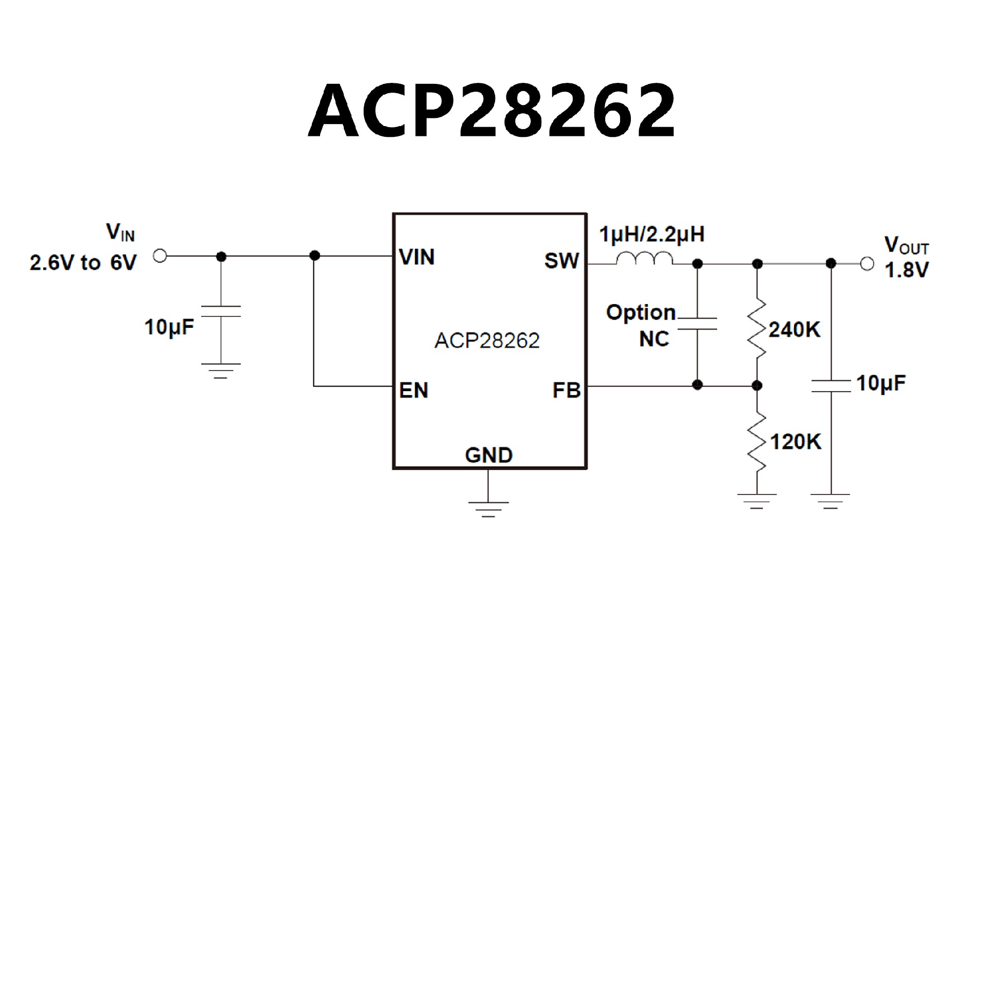 The ACP28262 is a high-efficiency, DC to DC step down switching regulators, capable of delivering up to 2A of output current. The device operates from an input voltage range of 2.6V to 5.5V and provides an output voltage from 0.6V to VIN. Working at a fixed frequency of 2MHz allows the use of small external components, such as ceramic input and output caps, as well as small inductors, while still providing low output ripples. This low noise output along with its excellent efficiency achieved by the internal synchronous rectifier, making ACP28262 an ideal replacement for large power consuming linear regulators. Internal soft-start control circuitry reduces inrush current. Short-circuit and thermal shutdown protection improves design reliability. The device is available in SOT25 package.