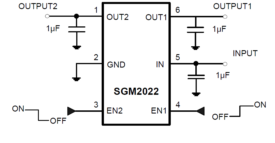 The SGM2022 is a dual, low-power, low-dropout, CMOS linear voltage regulator. It operates from a 2.5V to 5.5V input voltage and delivers up to 250mA at each channel. The SGM2022 is the perfect choice for low voltage, low power applications. The ground current is 190μA (both LDO’s enabled and active) that makes this part attractive for battery operated power systems. The SGM2022 also offers low dropout voltage (250mV at 250mA output) to prolong battery life in portable electronics.