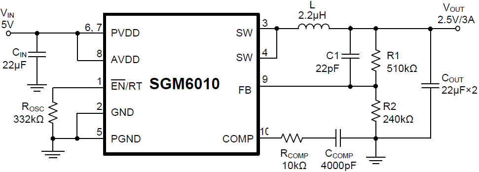 The SGM6010 is a high efficiency synchronous, step-down DC/DC converter. Its input voltage range is from 3V to 5.5V and provides an adjustable regulated output voltage from 0.8V to 5V while delivering up to 3A of output current.