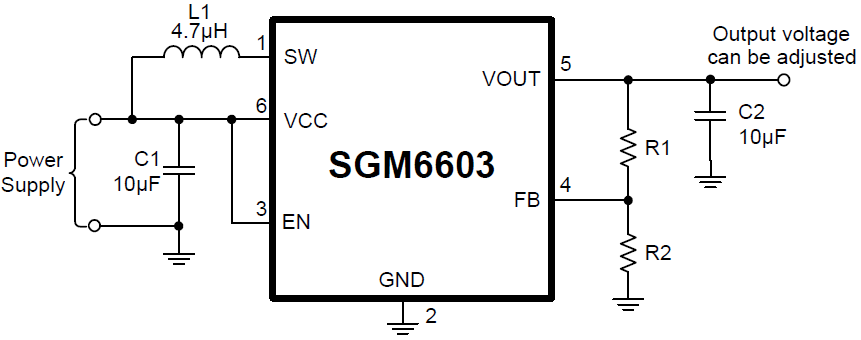 For light load current, the SGM6603 enters into the power-save mode to maintain high efficiency. Anti-ringing control circuitry reduces EMI concerns by damping the inductor in discontinuous mode. The SGM6603 provides true output disconnect and this allows VOUT to go to zero volt during shutdown without drawing any current from the input source.