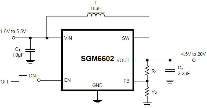 The SGM6602 operates with a switching frequency at 1.15MHz. This allows the use of small external components. The SGM6602 has an internal default 12V output voltage setting by connecting the FB pin to the VIN pin. Thus it only needs three external components to get 12V output voltage. Together with CSP package, the SGM6602 gives a very small overall solution size. The SGM6602 has typical 1050mA switch current limit. It has 5ms built-in soft-start time to minimize the inrush current. When the SGM6602 is in shutdown mode, the isolation switch disconnects the output from input to minimize the leakage current. The SGM6602 also implements output short circuit protection, output over-voltage protection and thermal shutdown.