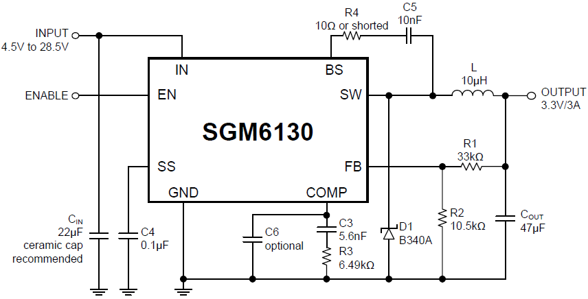 The SGM6130 is a current-mode step-down regulator with an internal power MOSFET. This device achieves 3A continuous output current over a wide input supply range from 4.5V to 28.5V with excellent load and line regulations. The switching frequency of SGM6130 is 385kHz and current mode operation provides fast transient response and eases loop stabilization.