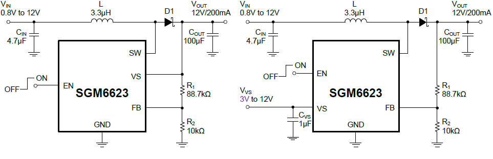 The SGM6623 is a general-purpose miniature boost DC/DC switching regulator with high-efficiency for battery-backup and standby power systems. The acceptable input voltage range is between 0.8V and 12V that can be converted to a regulated 3.3V to 13V output voltage with efficiency as high as 90%. SGM6623 can be used as backup charger for systems with 1- to 4-cell batteries. It operates at a 600kHz nominal switching frequency, allowing the use of small and low-profile inductor for compact design. It also has several built-in protection features, such as cycle-by-cycle over- current limit, soft-start, thermal shutdown and open loop over-voltage protection.