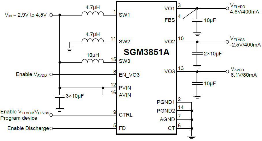 The SGM3851A is designed to drive AMOLED displays (Active Matrix Organic Light Emitting Diode) requiring VAVDD, VELVDD and VELVSS. The device integrates a boost converter for VELVDD, an inverting buck-boost converter for VELVSS and a boost converter for VAVDD, which are suitable for battery operated products. The digital interface control pin (CTRL) allows programming VAVDD, VELVDD and VELVSS in digital steps.
