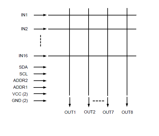 The SGM6514 crosspoint switch provides flexible options for applications. The 16 inputs can be routed to any of 8 outputs. Each input can be routed to one or more outputs,