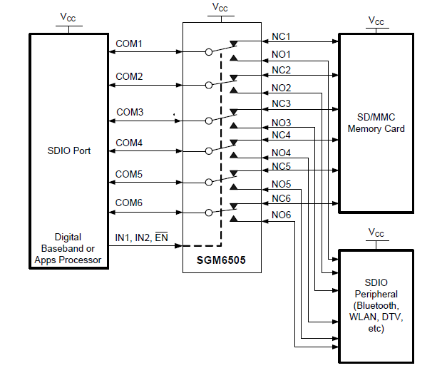 The SGM6505 allows any SD, SDIO, and multimedia card host controllers to be expanded out to multiple cards or peripherals since the SDIO interface consists of 6-bits: CMD, CLK, and Data [0:3] signals. The SGM6505 has two control pins that give additional flexibility to the user. For example, the ability to mux two different audio-video signals in equipment such as an LCD television, an LCD monitor, or a notebook docking station.