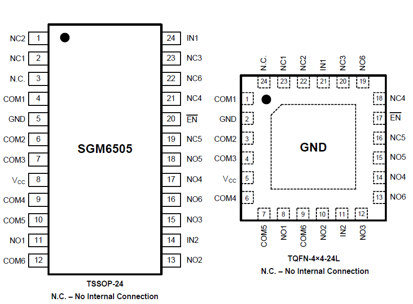 transmitted in either direction. The SGM6505 has two control pins, each controlling three 1-of-2 muxes at the same time, and an enable pin that is used to put all outputs in high-impedance mode. The control pins are compatible with 1.8V logic thresholds and are backward compatible with 2.5V and 3.3V logic thresholds as well.