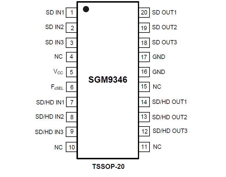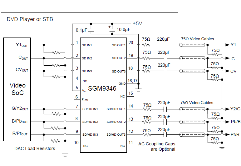 The SGM9346 Low Cost Video Filter (LCVF) is intended to replace passive LC filters and drivers with a low-cost integrated device. Six 6th-order Butterworth filters provide improved image quality compared to typical passive solutions. The combination of low power Standard Definition (SD) and High Definition (HD) filters greatly simplifies DVD video output circuitry. Three channels offer fixed SD filters while the other three are selectable between SD and HD filters.