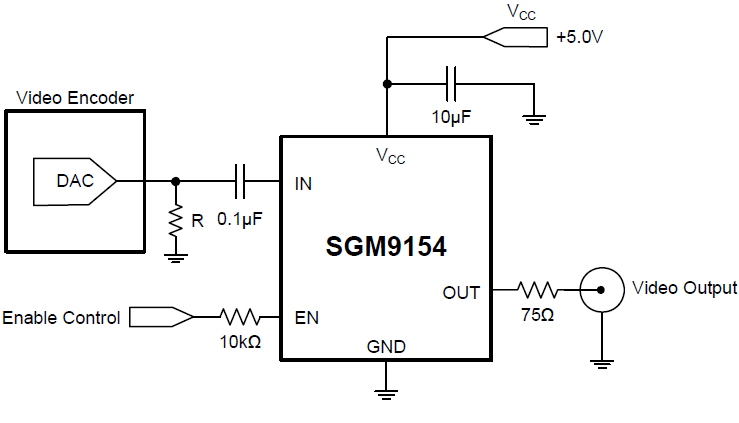 The SGM9154 video filter is intended to replace passive LC filters and drivers with an integrated device. The 6th-order channel offers High Definition (HDp) filter. The SGM9154 may be directly driven by a DC-coupled DAC output or an AC-coupled signal. Internal bias circuitry provides constant bias voltage for AC-coupled input. The output can be AC- or DC-coupled. DC coupling the output removes the need for large output coupling capacitors.