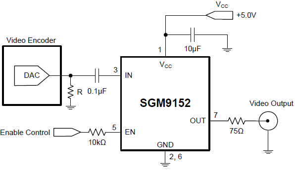 The SGM9152 video filter is intended to replace passive LC filters and drivers with an integrated device. The 6th-order channel offers High Definition (HDp) filter. The SGM9152 may be directly driven by a DC-coupled DAC output or an AC-coupled signal. Internal bias circuitry provides constant bias voltage for AC-coupled input. The output can be AC- or DC-coupled. DC coupling the output removes the need for large output coupling capacitors.