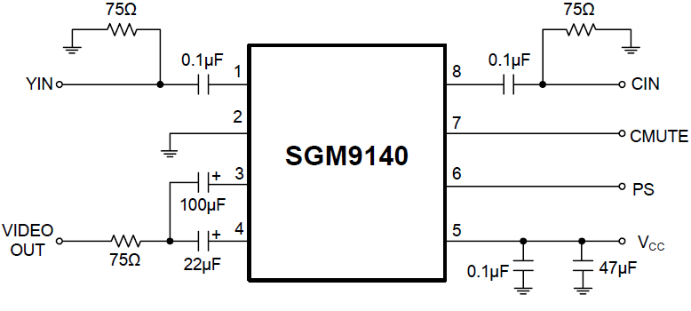 The SGM9140 is a low power, low voltage operation video amplifier with Y/C mixer and 75Ω driver. SGM9140A is 12.4dB gain driver, and SGM9140B is 6.4dB gain driver.