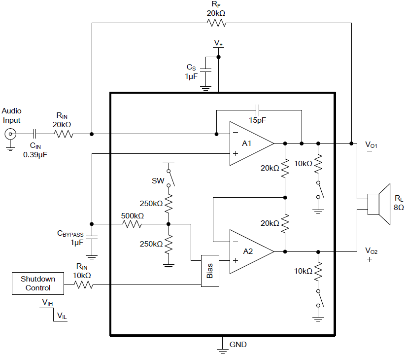 The SGM4891 features a low power consumption shutdown mode, which is achieved by driving the shutdown pin with a logic low. Additionally, the SGM4891 features an internal thermal shutdown protection mechanism.