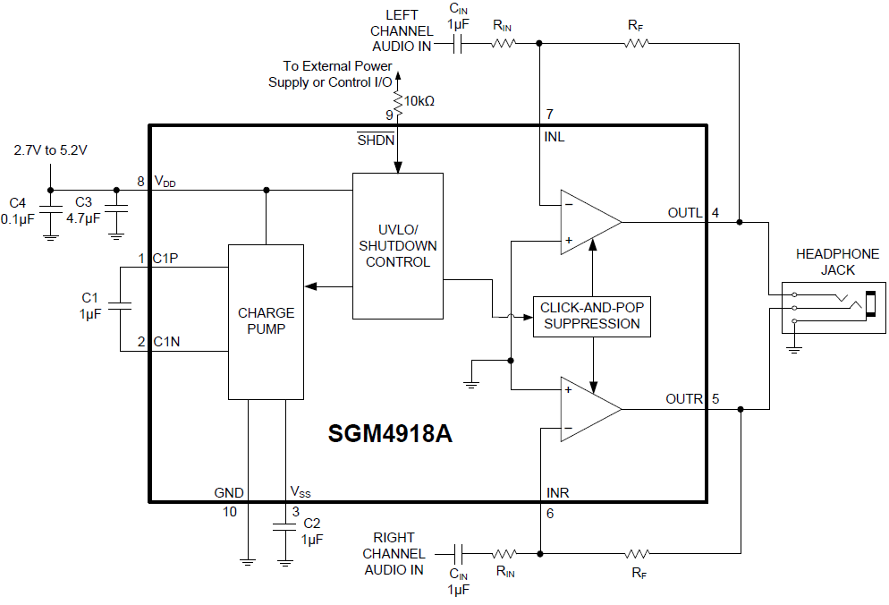 The SGM4918 stereo headphone amplifier is designed for portable equipment where board space is at a premium. The SGM4918 uses capless architecture to