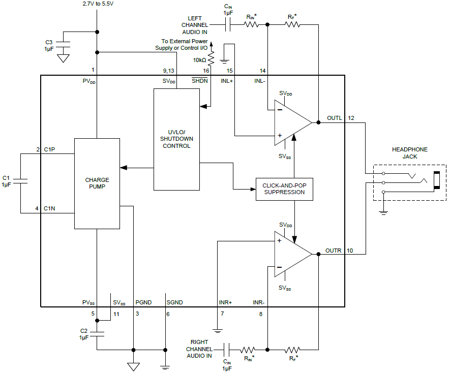 The SGM4917 stereo headphone amplifier is designed for portable equipment where board space is at a premium. The SGM4917 uses capless architecture to produce a ground-referenced output from a single power supply, eliminating the need for large DC-blocking capacitors for output, saving cost, board space, and component height. Additionally, for SGM4917B, the gain is set internally (-2V/V), further reducing component count. For SGM4917A, the gain can be adjusted by external feedback resistors.