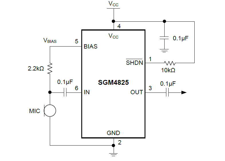 The SGM4822/SGM4825 (single-input) and SGM4823/ SGM4826 (dual-input) are low noise, low power, fixed- gain microphone amplifiers. They offer tiny packaging and a low noise, integrated microphone bias, making them ideal for portable audio applications such as notebook computers, smart phones, and digital cameras. These amplifiers feature a 2.6MHz bandwidth, rail-to-rail outputs, an industry-leading and a very low 0.009% THD+N in active mode, forced shutdown mode that cuts the combined supply and bias currents to only 100nA. The SGM4822/SGM4823 power-saving features include automatic switching between low power monitor mode and low noise active mode, and also provide latched push-pull output to wake up external MCU in sleeping mode.