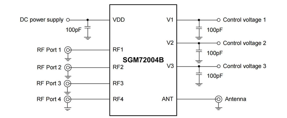 The SGM72004B has the ability to integrate SP4T RF switch and GPIO controller on a SOI chip. Internal driver and decoder for switch control signals are offered by the GPIO controller, which makes it flexible in RF path band and routing selection.