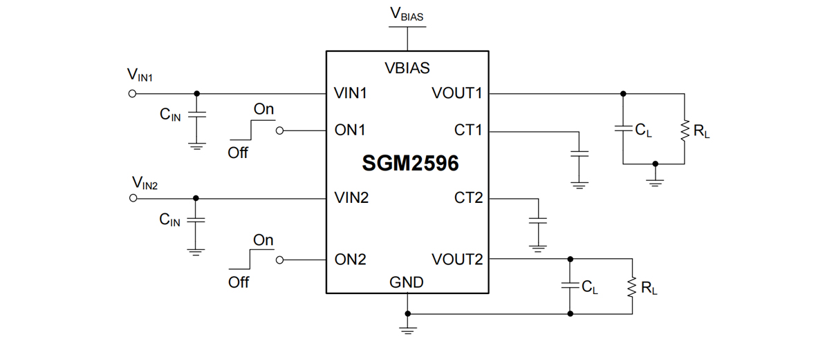 The SGM2596 and SGM2596D are 16mΩ (TYP) on-resistance, integrated two N-MOSFETs, dual-channel load switches. The devices can operate over a wide input voltage range of 0.6V to 5.7V. Each channel can support a 6A maximum continuous load current and is independently controlled by the ONx pin (ON1 or ON2). The VOUTx rise time can be programmed by setting an additional capacitor to the CTx pin.