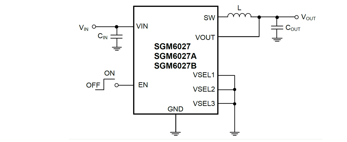 The SGM6027, SGM6027A and SGM6027B are small and efficient 2.5V to 5.5V synchronous Buck converters with ultra-low quiescent current (580nA TYP). The SGM6027 output can be programmed to 8 selectable output voltages from 1.2V to 3.3V by 3 logic selected pins. It can deliver up to 600mA output current continuously or 1310mA peak for a short time. For the SGM6027A, the 8 programmable voltages are in the range of 0.7V to 3.1V and the output can deliver 600mA continuous output current or 870mA peak. For the SGM6027B, the 8 programmable voltages are in the range of 1.3V to 3.1V and the output can deliver 600mA continuous output current or 870mA peak. All the devices offer high efficiency at light loads by entering into the PFM mode.
