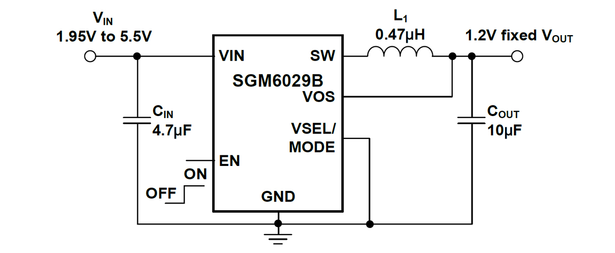 The SGM6029 family is a low voltage, efficient and miniature synchronous Buck converter with ultra-low quiescent current. Operating at high switching frequency (4.0MHz, TYP), miniature inductors and capacitors can be used to achieve minimal solution size. The rated load current is from 0.6A to 1A depending on the input voltage and operating frequency. For high light-load efficiency, the operating mode can smoothly and automatically change between power-save mode and PWM.