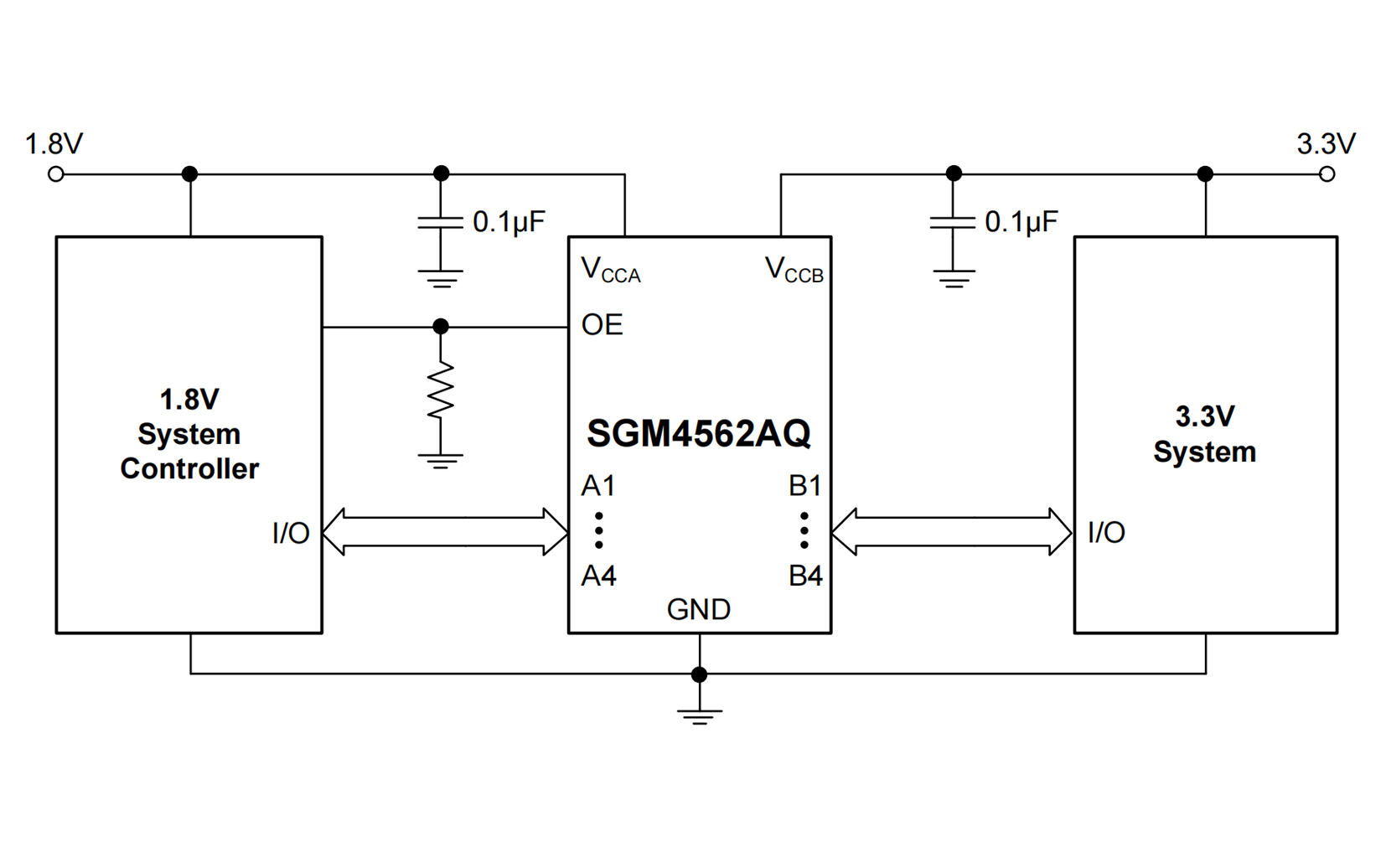 The SGM4562AQ is a 4-bit, non-inverting, bidirectional voltage-level translator which features two independent configurable power-supply lines. The A and B ports track the VCCA supply and VCCB supply respectively. The supply voltage ranges from 0.9V to 3.6V for both A and B ports. The device provides a bidirectional translation function among different voltage nodes (including 1V, 1.2V, 1.5V, 1.8V, 2.5V and 3.3V).