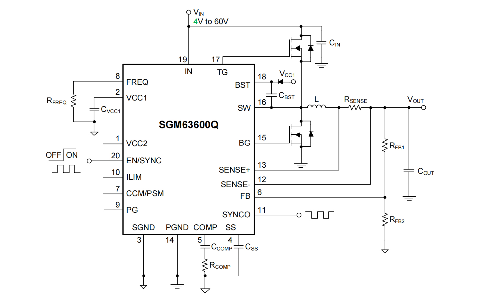 The SGM63600Q is a 4V to 60V current mode controller for synchronous Buck converters. It is capable to efficiently drive two N-MOSFETs over the whole voltage range.