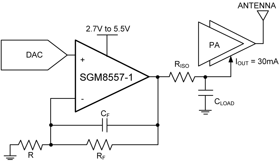 The SGM8557-1 (single), SGM8557-3 (single with shutdown), SGM8557-2 (dual) and SGM8557-5 (dual with shutdown) high output drive CMOS operational amplifiers feature a peak output current of 240mA, rail-to-rail output capability from a single 2.7V to 5.5V supply. These amplifiers exhibit a high slew rate of 7V/μs and a gain-bandwidth product (GBP) of 15MHz. The SGM8557-3/5 offer a shutdown feature that drives the output low. The SGM8557-1/2/3/5 offer low input offset voltage, low input offset voltage drift, wide bandwidth and high output drive.