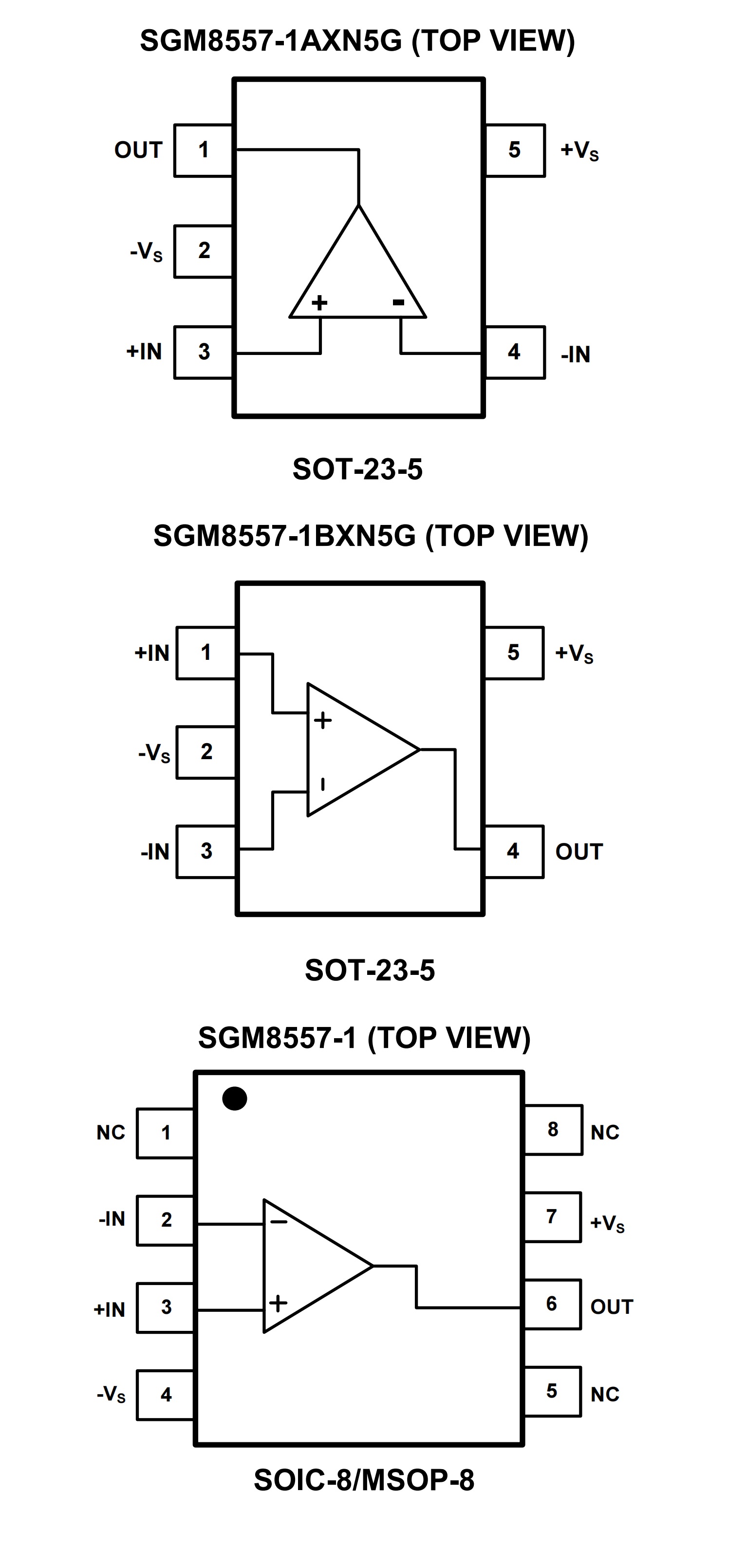The SGM8557-1 is available in Green SOIC-8, MSOP-8 and SOT-23-5 packages. They operate over an ambient temperature range of -40℃ to +125℃.