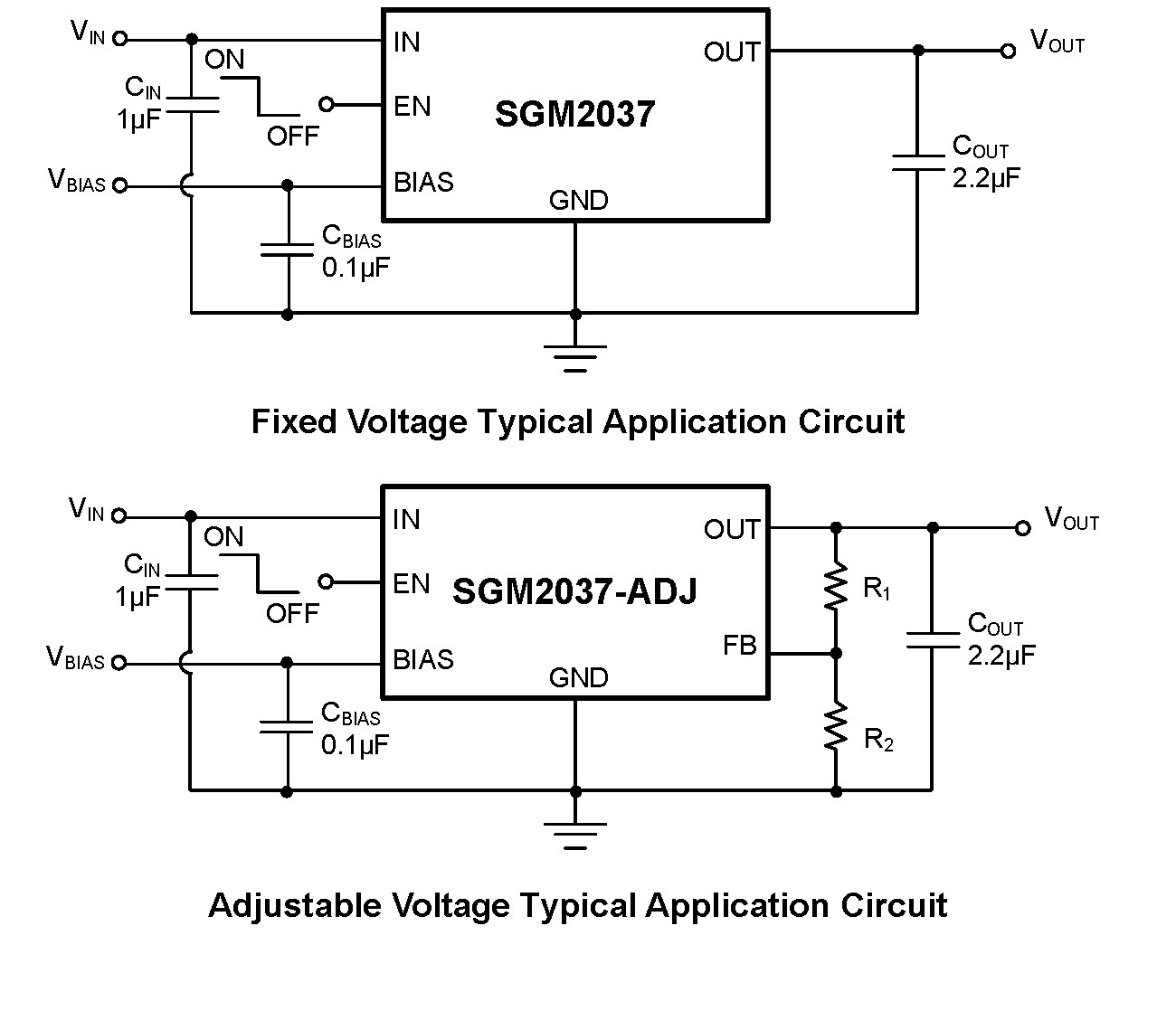 The SGM2037 is a low noise, 500mA LDO equipped with NMOS pass transistor and a separate bias supply voltage (VBIAS). The device provides very stable, accurate output voltage with low noise suitable for space constrained and noise sensitive applications. In order to optimize performance for battery operated portable applications, the SGM2037 features low IQ consumption.
