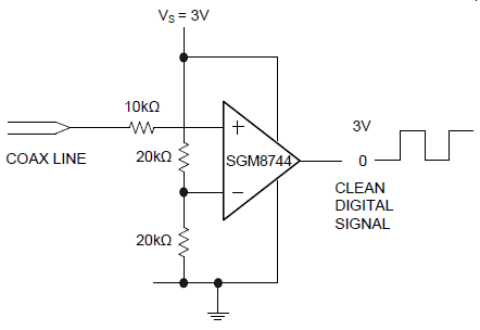 The SGM8744 is a single high-speed comparator optimized for systems powered from a 3V or 5V supply. The device features high-speed response, low-power consumption, and rail-to-rail input range. Propagation delay is 6ns, while supply current is only 1.3mA. The input common mode range of the SGM8744 extends beyond both power supply rails. The output pulls to within 0.1V of either supply rail without external pull-up circuitry, making the device ideal for interface with both CMOS and TTL logics. All input and output pins can tolerate a continuous short-circuit fault condition to either rail. Internal hysteresis ensures clean output switching, even with slow-moving input signals.