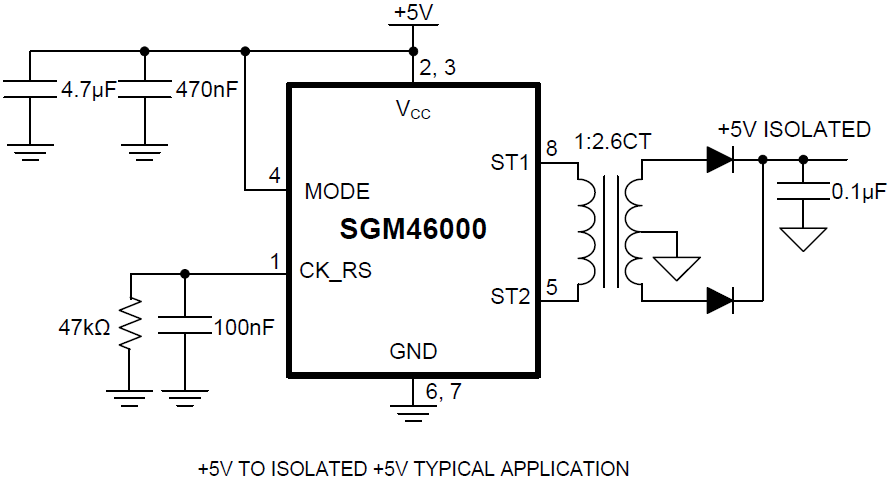 The SGM46000 is an integrated primary-side controller and H-bridge driver for isolated power-supply circuits. The device contains an on-board oscillator, protection circuitry and internal FET drivers to provide up to 3W of power to the primary winding of a transformer from +5V power supply. The SGM46000 can be operated using the internal programmable oscillator or can be driven by an external clock for improved EMI performance. Regardless of the clock source being used, an internal flip-flop stage guarantees a fixed 50% duty cycle to prevent DC current flow in the transformer.