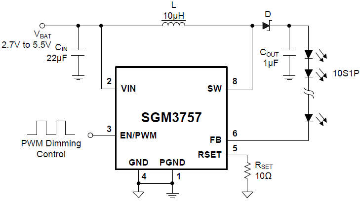 The default white LED current is set with the external sensor resistor, RSET, and the feedback voltage is regulated to 200mV, as shown in the typical application. During the operation, the LED current can be controlled by using a pulse width modulation (PWM) signal applied to the EN/PWM pin, through which the duty cycle determines the feedback reference voltage. The SGM3757 does not burst the LED current; therefore, it does not generate audible noises on the output capacitor. For maximum protection, the device features integrated open LED protection that disables the SGM3757 to prevent the output voltage from exceeding the IC absolute maximum voltage ratings during open LED conditions.