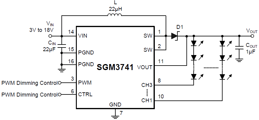 The SGM3741 is a 3-Channel step-up DC/DC converter designed for driving the white LEDs with an internal 25mA constant current per channel. This device features integrated, 38V power MOSFETs that is capable of driving up to 10 white LEDs per channel, providing inherent current matching for uniform brightness. The SGM3741 supports two PWM signals to control the backlight brightness. The PWM frequency is in the range from 2kHz to 60kHz to avoid audible noise from inductor or ceramic capacitor, combining the two PWM to get very wide brightness dimming range. PWM pin is always used for Content Adaptive Brightness Control (CABC) schemes. Constant 600kHz switching frequency is used in SGM3741.