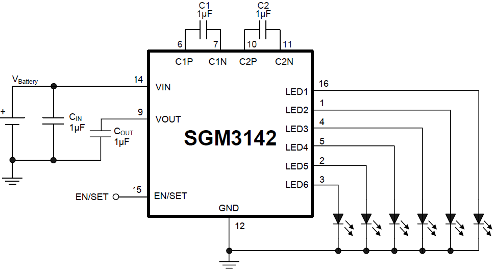 The SGM3142 is a high efficiency and cost effective charge pump white LED driver. It supports up to 6 white LEDs and regulates a constant current for uniform intensity. The part maintains the high efficiency by utilizing a 1×/1.5× fractional charge pump and low dropout current sources. The small equivalent 1× mode open loop resistance and ultra-low dropout voltage of current source extend the operating time of 1× mode and optimize the efficiency of Li-ion battery in white LED applications.