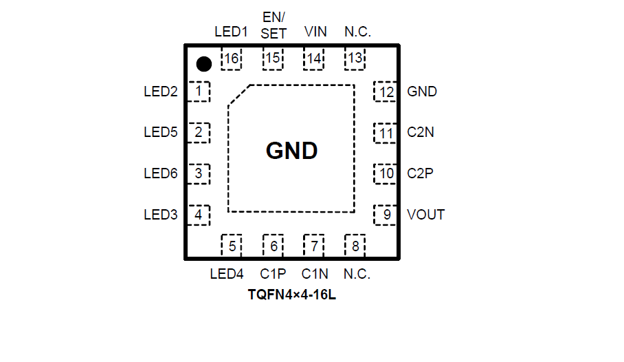 User can easily configure each LED current from 1.25mA to 20mA by a pulse dimming control. The dimming of white LEDs current can be achieved by applying a pulse signal to the EN/SET pin. There are totally 16 steps of current could be set by users. Theoperating voltage range is 2.7V to 5.5V. Internal soft start circuitry effectively reduces the in-rush current while both start-up and mode transition.